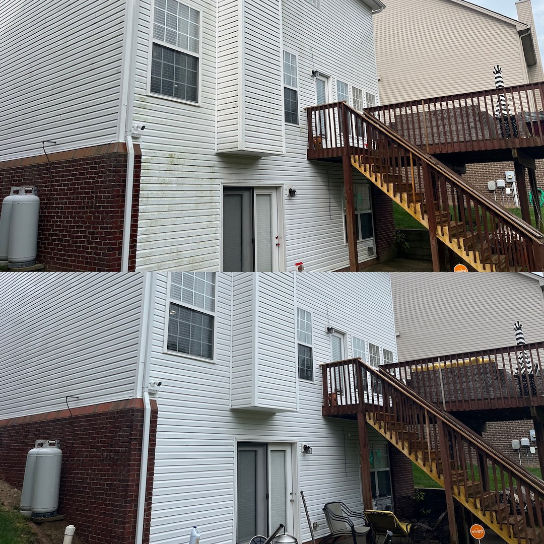 A homeowner in Lexington, KY contacted us needing a full exterior cleanup before listing their property. Their driveway was stained, the siding had green algae in several spots, and the back patio needed major attention. They were looking for a clean, bright exterior that would photograph well and make a strong first impression during showings.