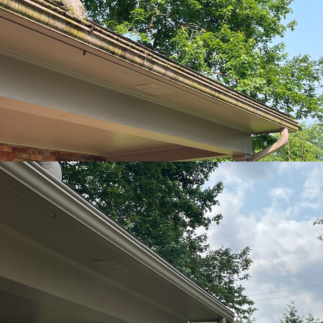 The transformation was immediate and dramatic. The gutters, once dull and streaked, now looked bright and refreshed, and the siding regained its original clean finish. The homeowner was amazed by the difference, it looked like a brand new home.